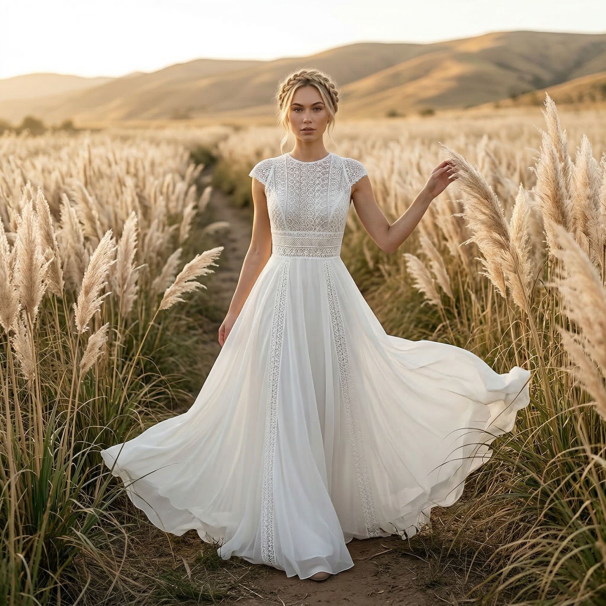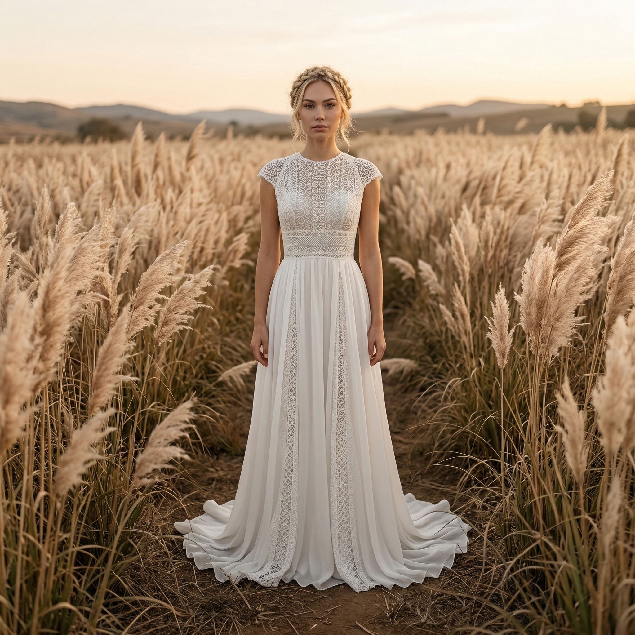 This vintage boho wedding dress features delicate lace cap sleeves paired with a soft chiffon skirt for a light and effortless look. The combination of textures creates a romantic feel while keeping the silhouette relaxed and comfortable.
