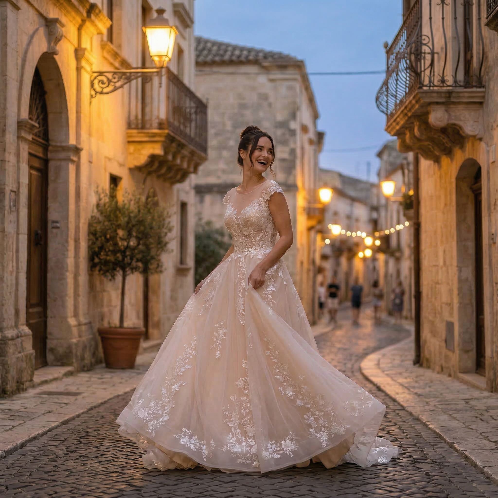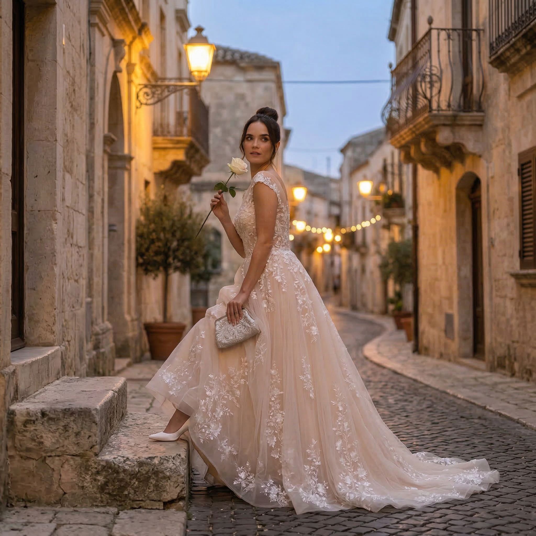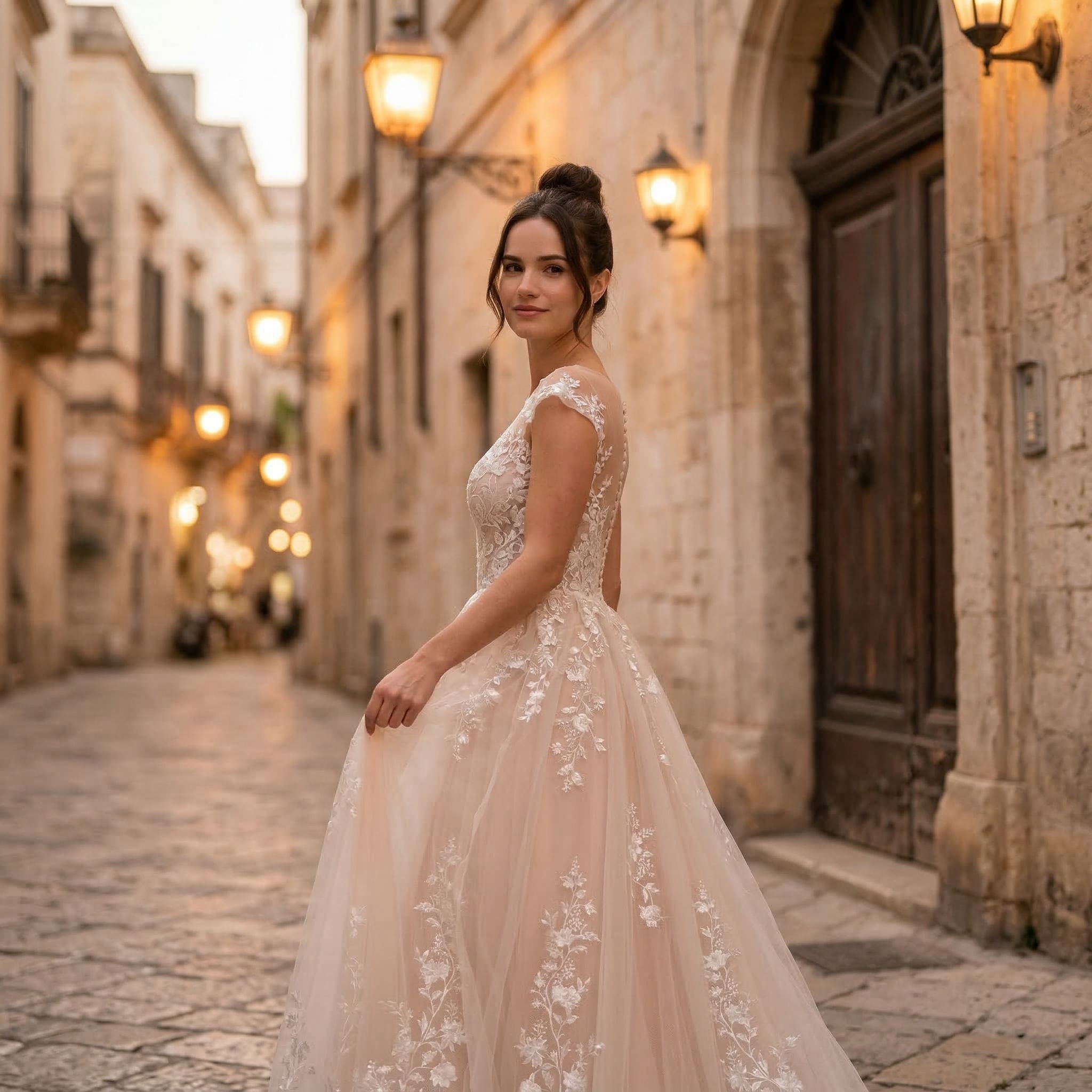 Designed for brides who want a natural and elegant style, this gown combines texture and detail without feeling heavy. The 3D flowers add dimension while keeping the overall look soft and feminine.