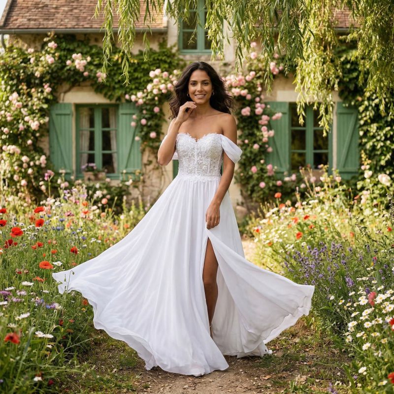 This bohemian wedding dress features a soft V-neck design with delicate lace and 3D floral detailing for a romantic, free-spirited look. The lightweight fabric and relaxed silhouette create effortless movement, making it perfect for outdoor and beach weddings.