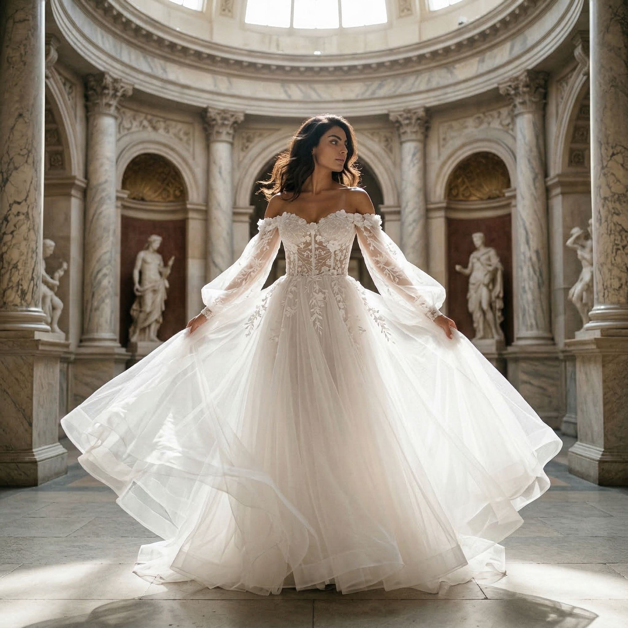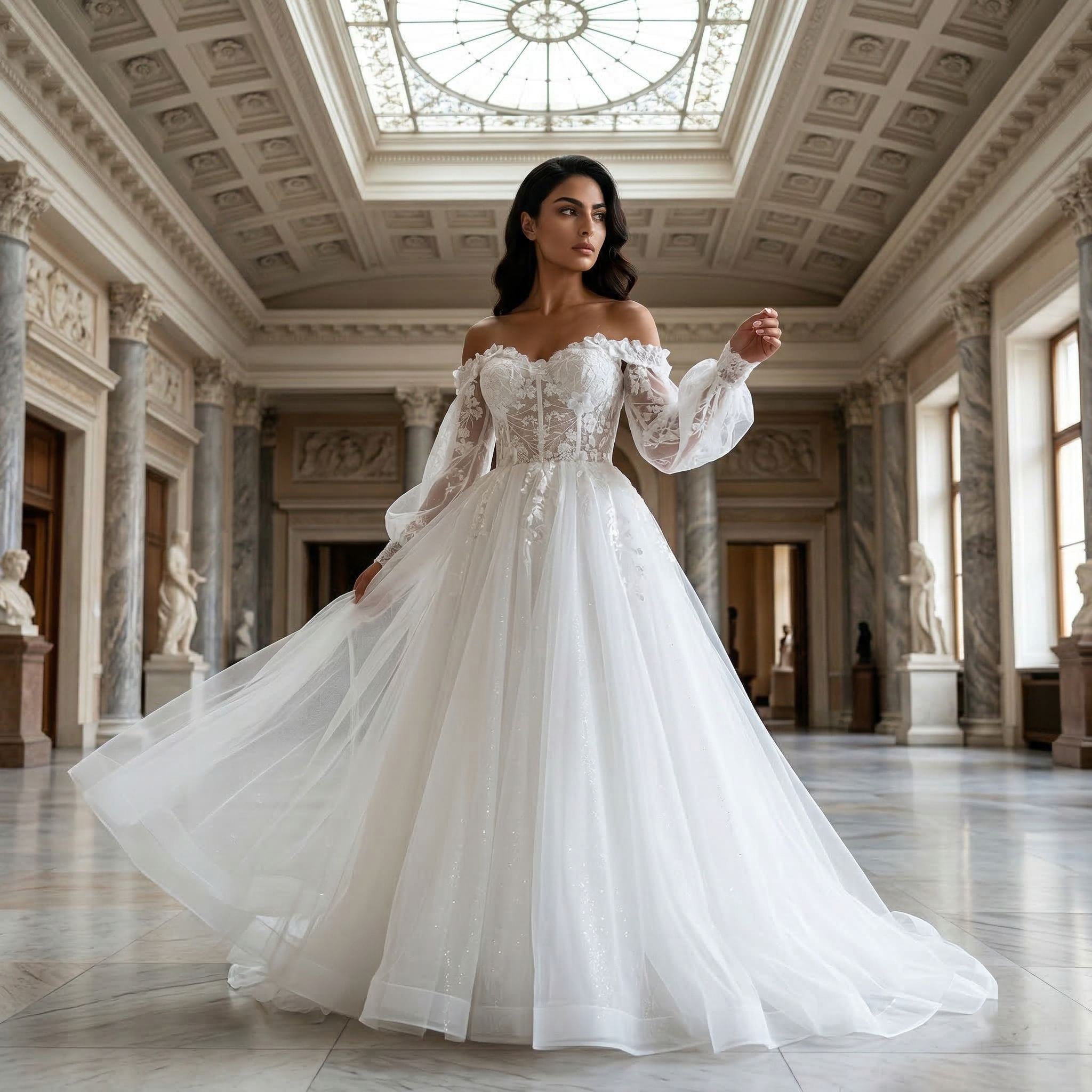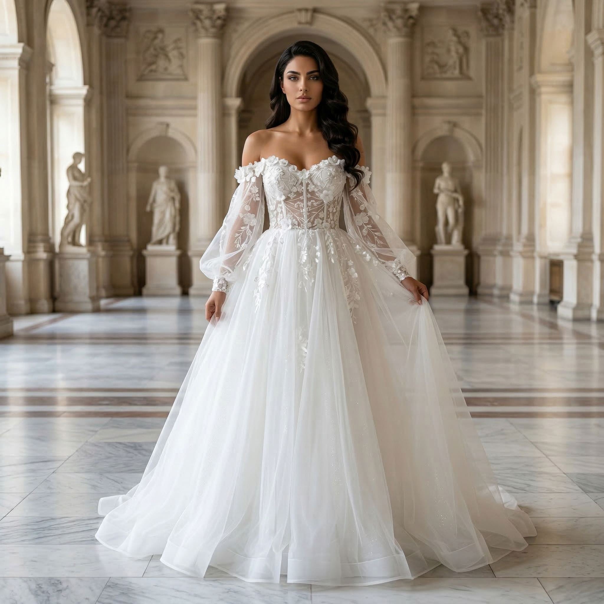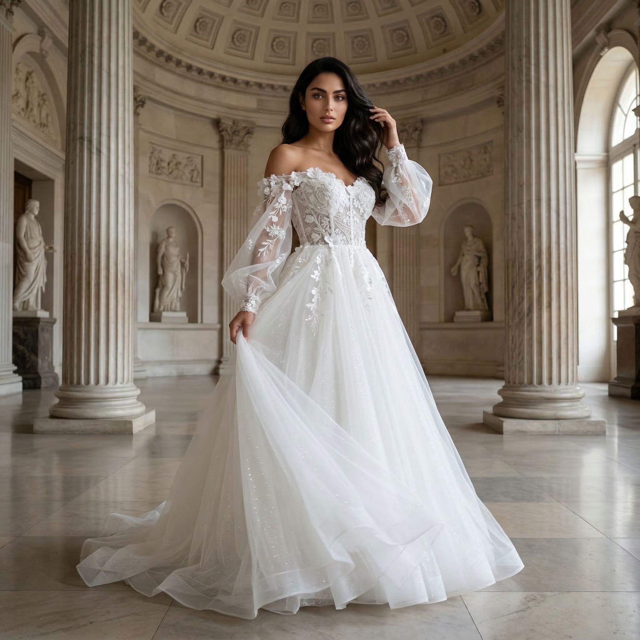 This boho wedding dress features soft puff sleeves with an off shoulder design for a relaxed and romantic bridal look. The lace and 3D floral detailing add texture and dimension, while the tulle fabric creates a light and airy feel.