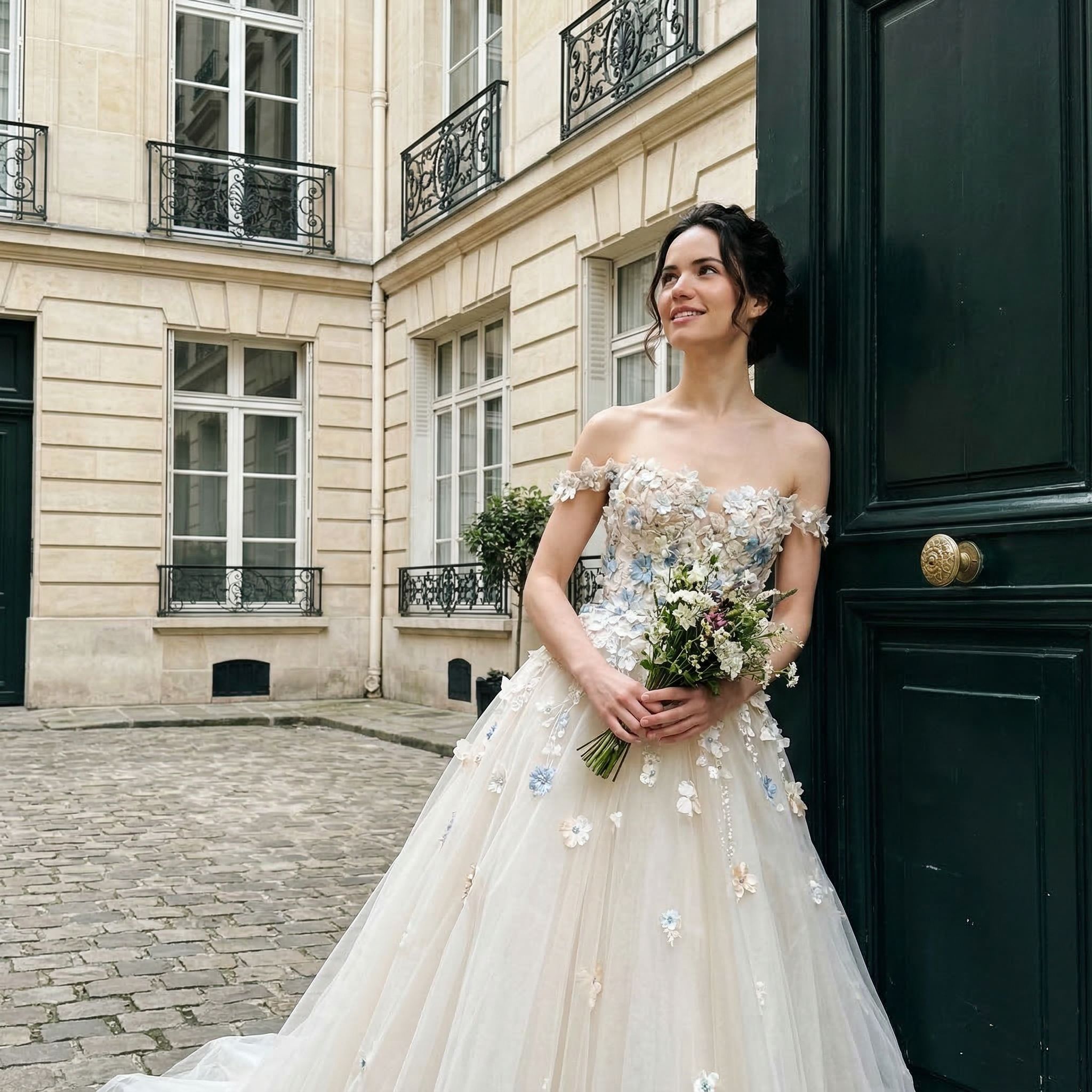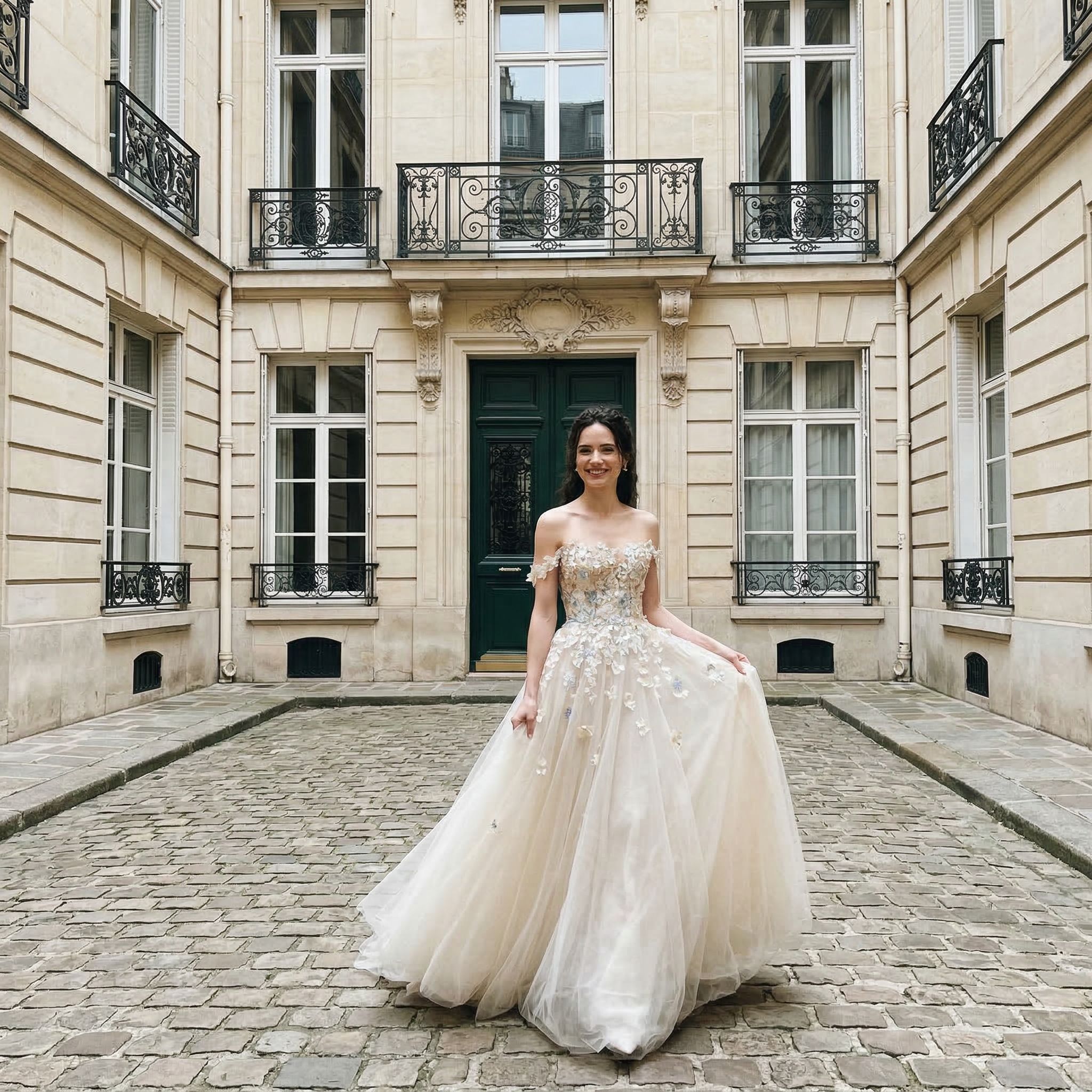 This floral princess prom dress features a light tulle design with soft floral detailing for a dreamy and elegant look. The airy fabric creates movement and volume, while the layered skirt adds a fairy-like touch.