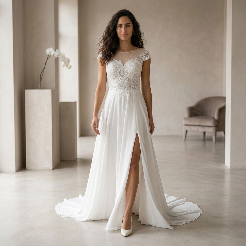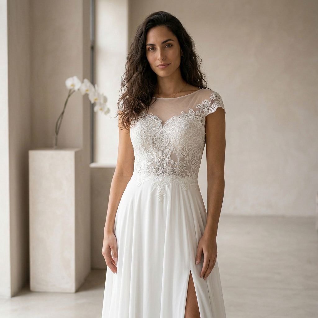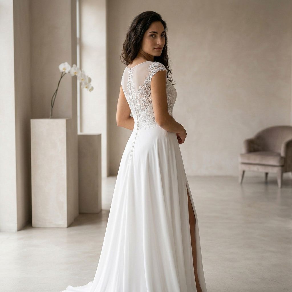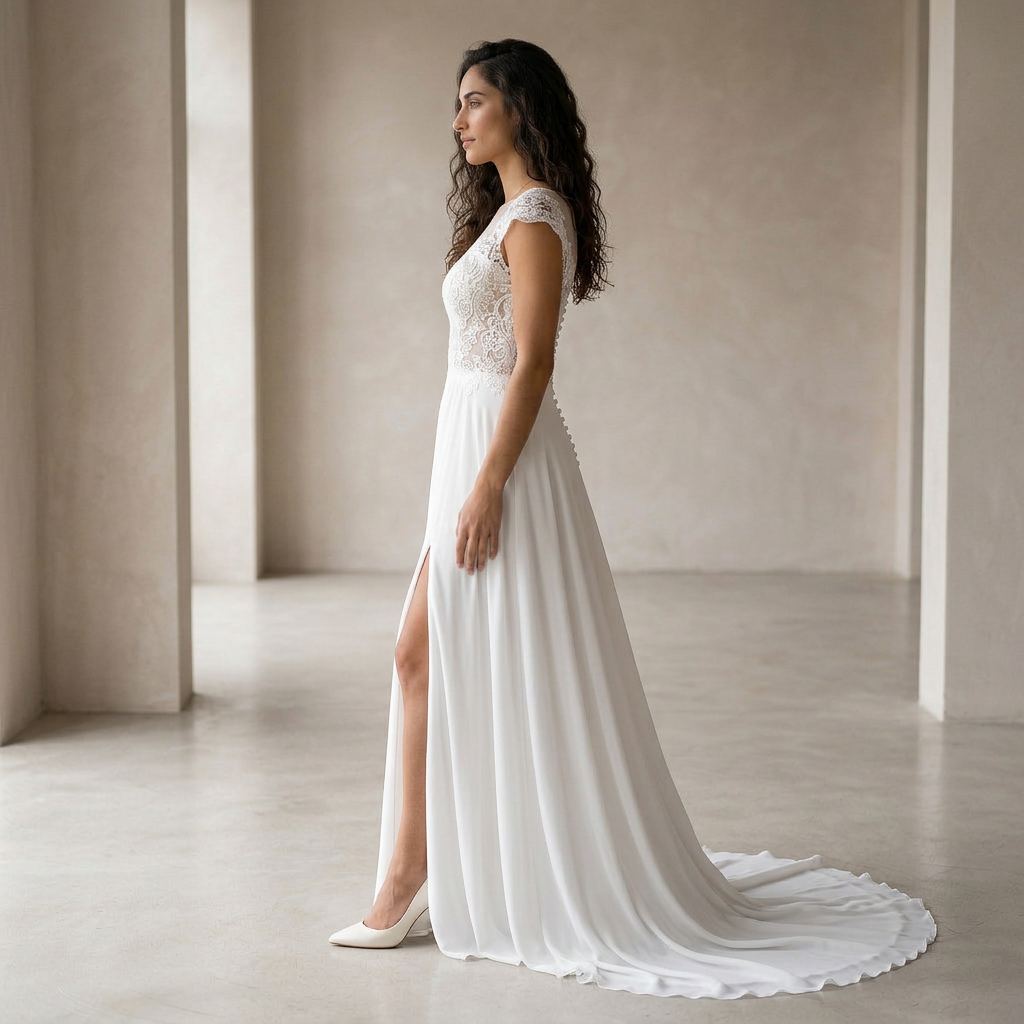 Designed for brides who want both elegance and movement, this gown combines classic lace with a contemporary touch. The flowing A-line skirt allows for comfort while maintaining a refined and graceful appearance.