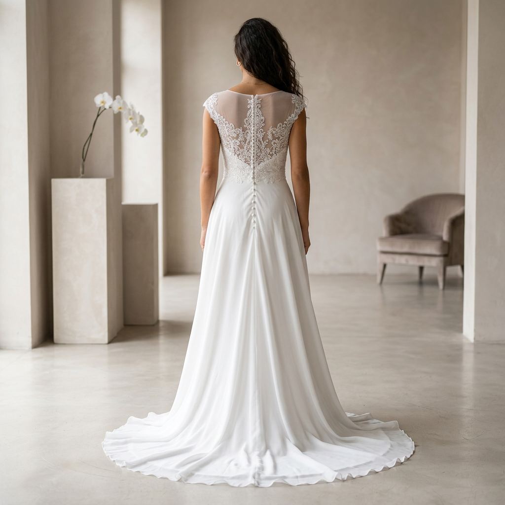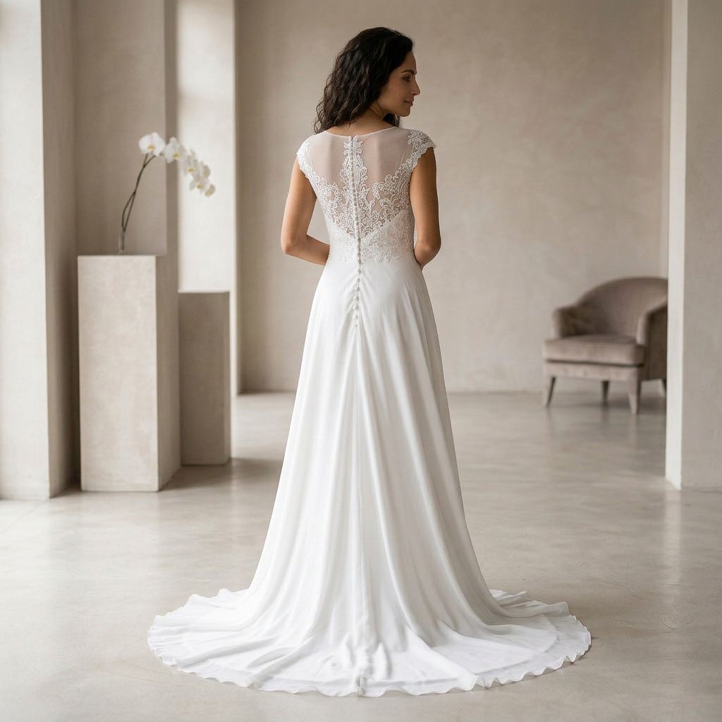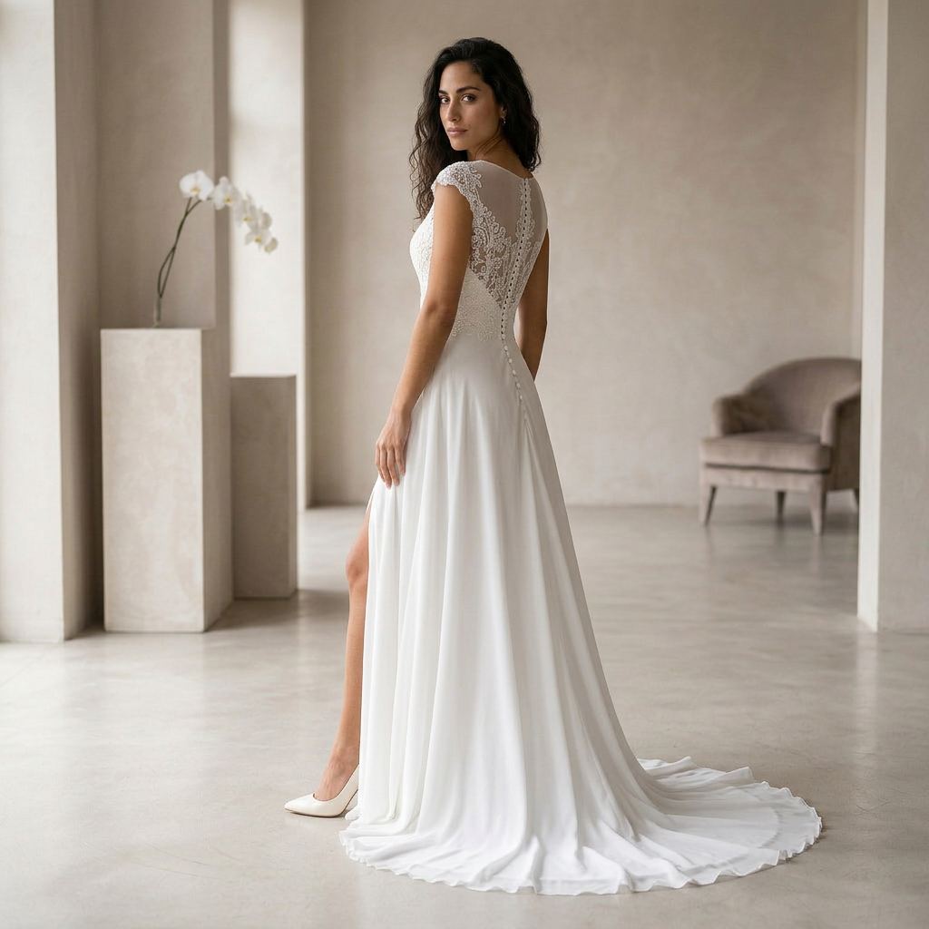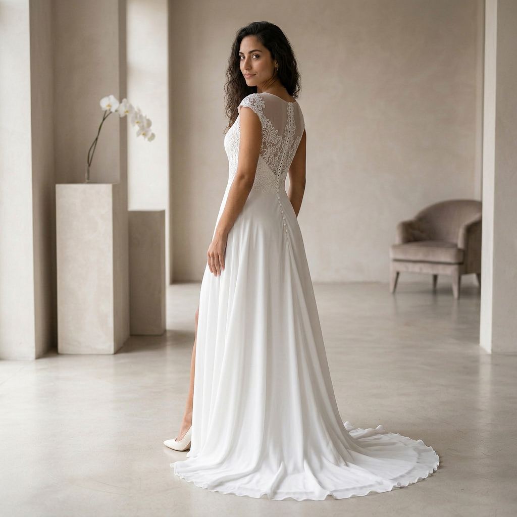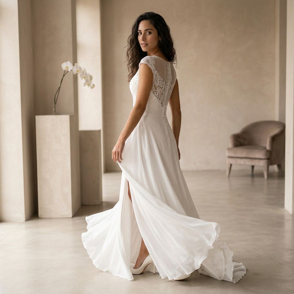 Designed for brides who want both elegance and movement, this gown combines classic lace with a contemporary touch. The flowing A-line skirt allows for comfort while maintaining a refined and graceful appearance.