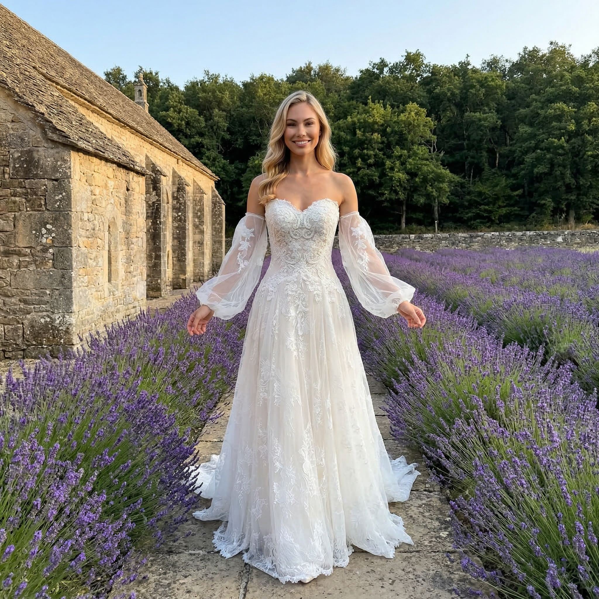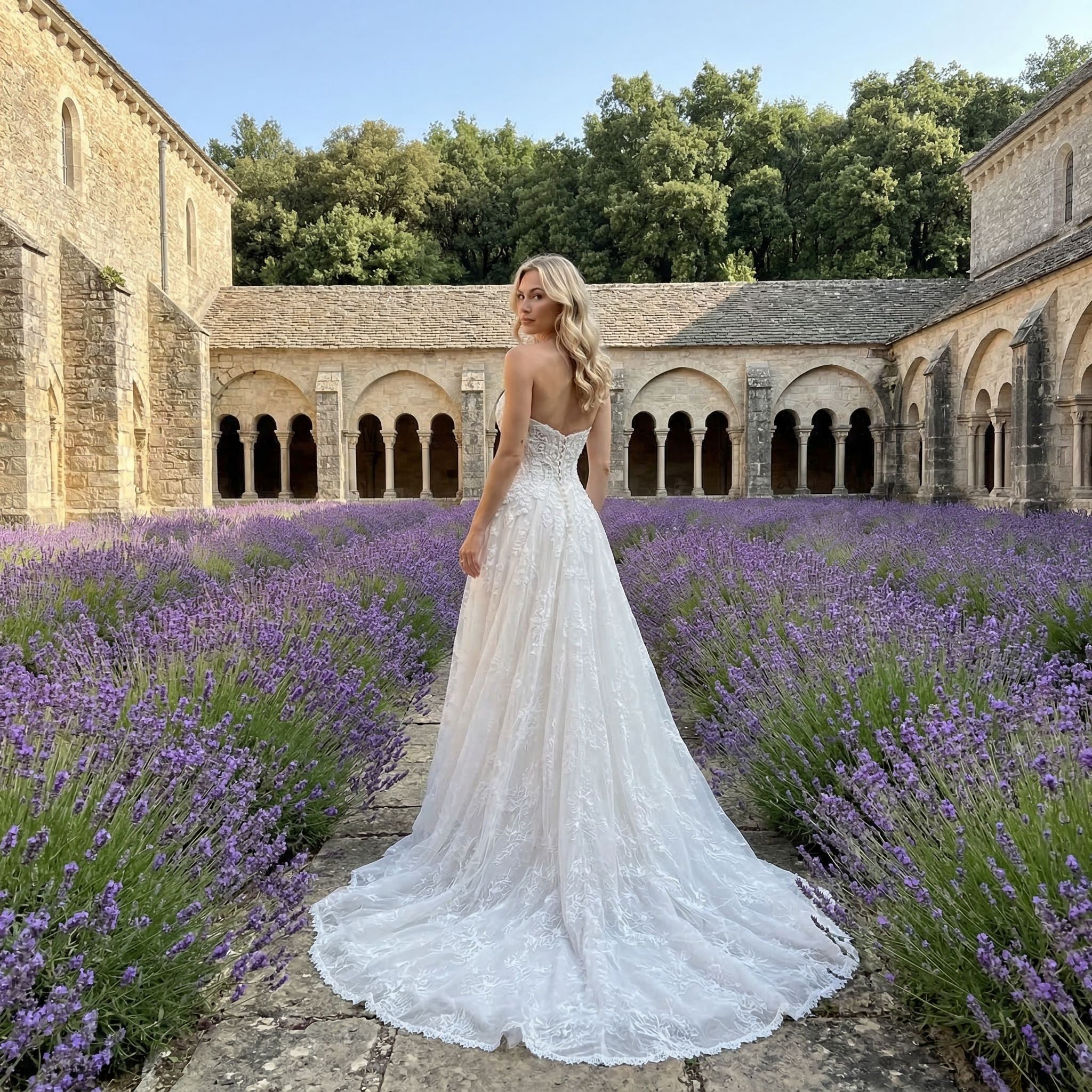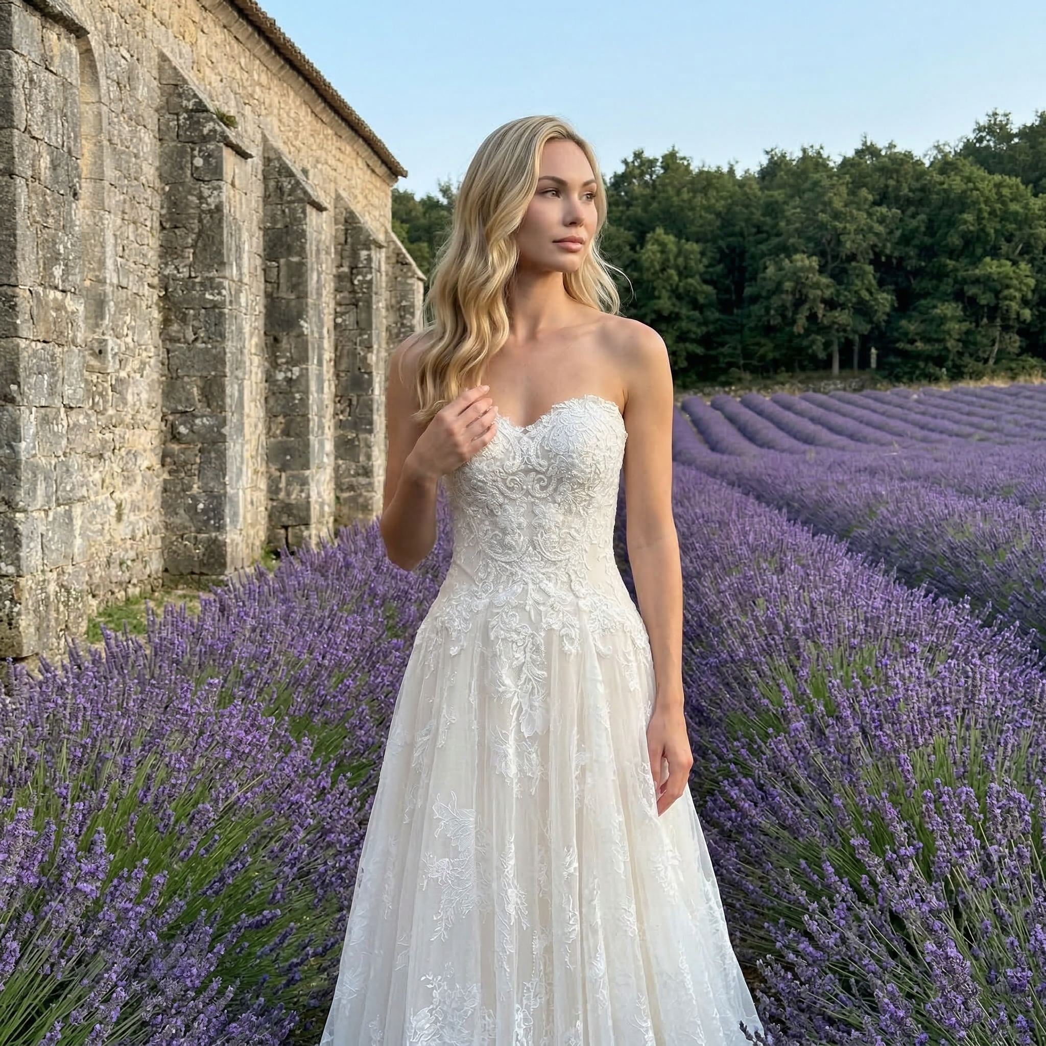 This lace mermaid wedding dress features a strapless neckline and a fitted silhouette designed to highlight your natural shape. The delicate lace detailing adds a romantic and elegant touch, while the mermaid cut creates a refined and modern bridal look.
