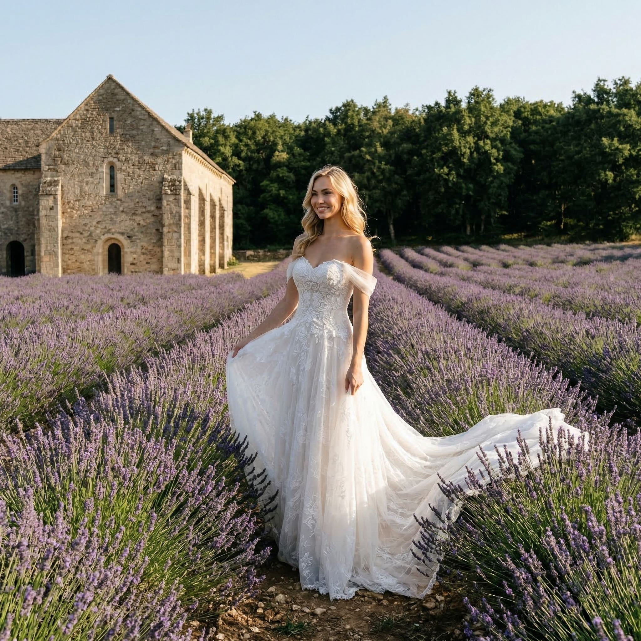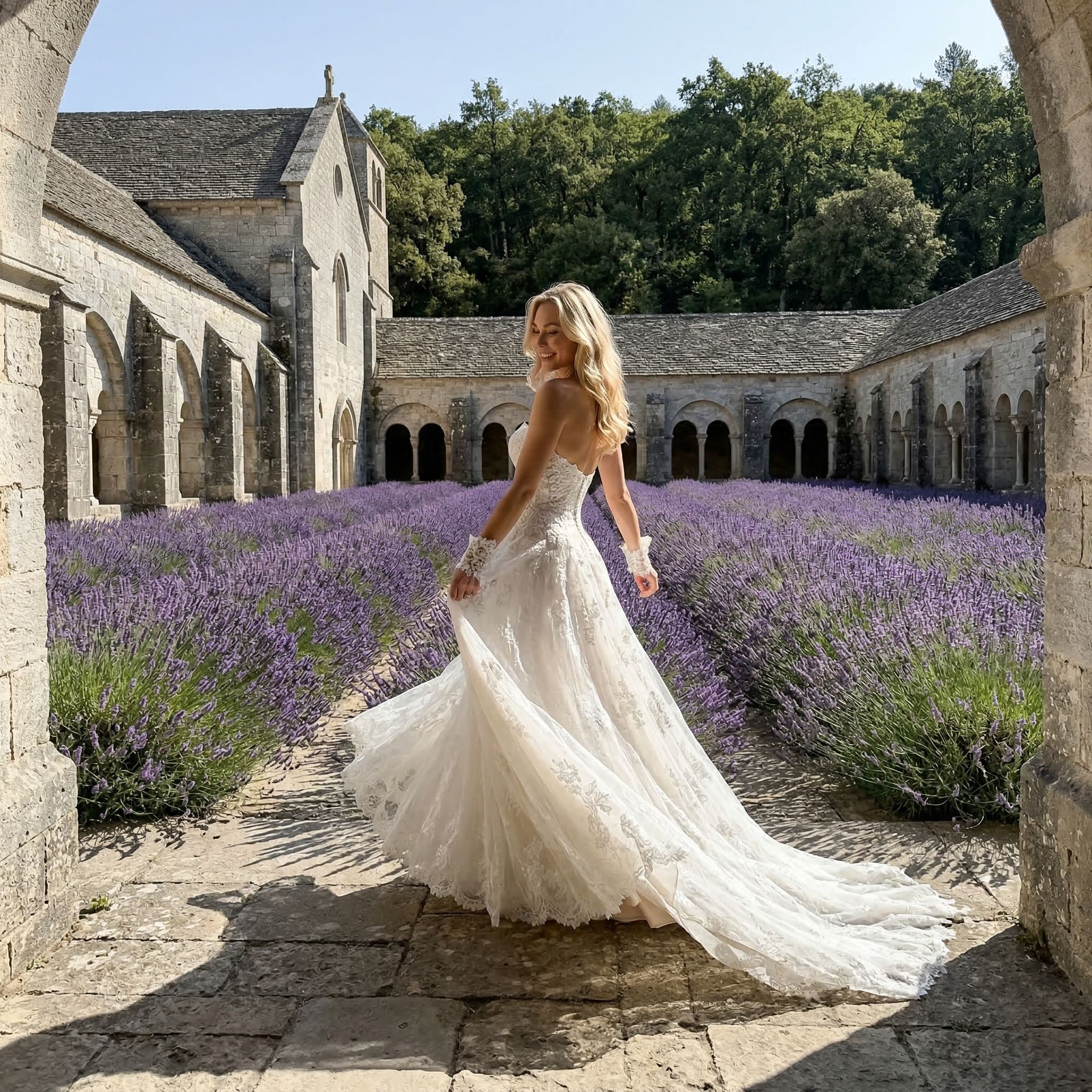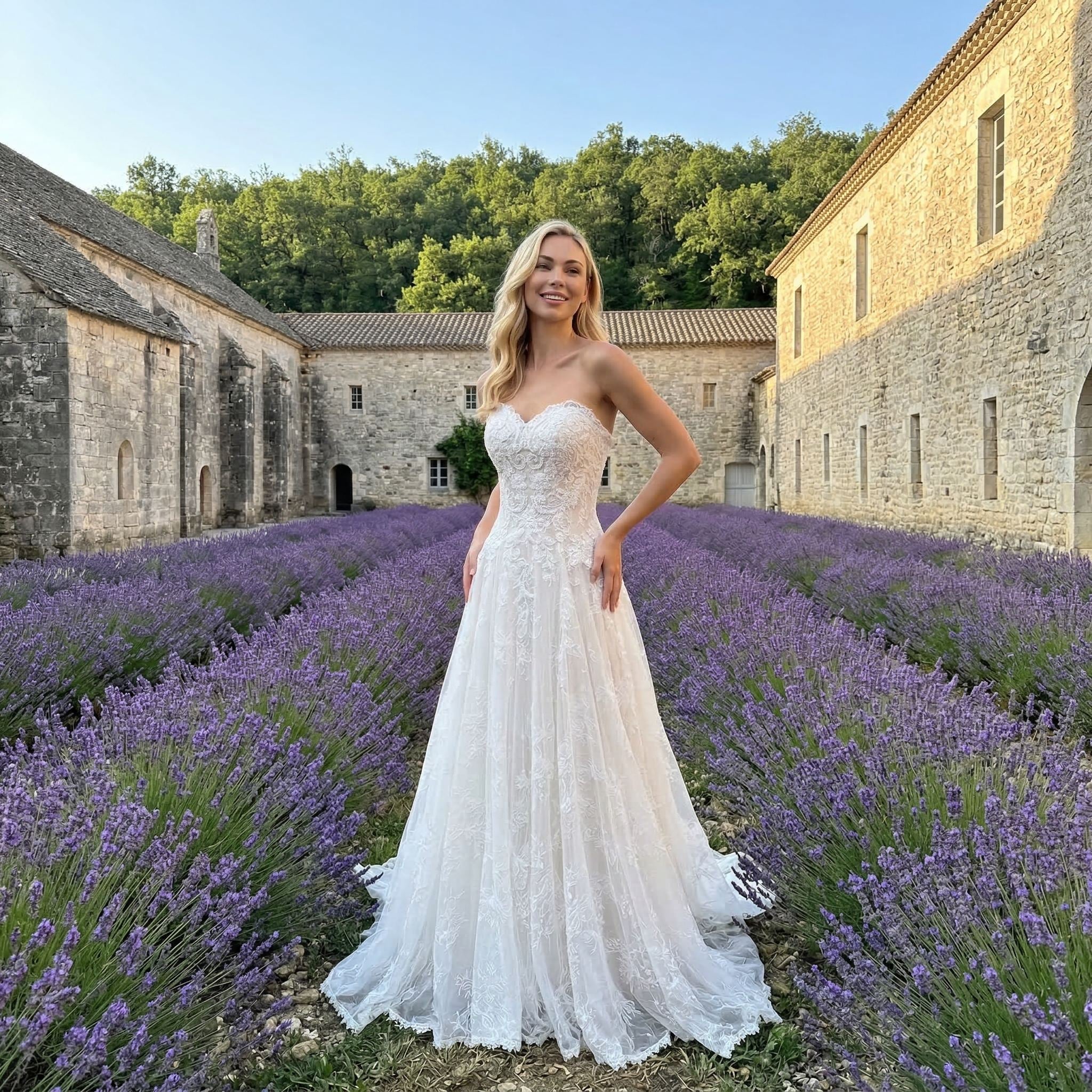 This lace mermaid wedding dress features a strapless neckline and a fitted silhouette designed to highlight your natural shape. The delicate lace detailing adds a romantic and elegant touch, while the mermaid cut creates a refined and modern bridal look.