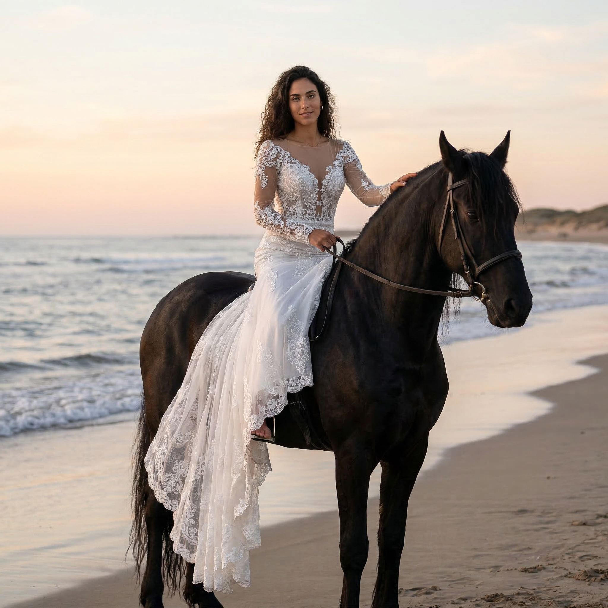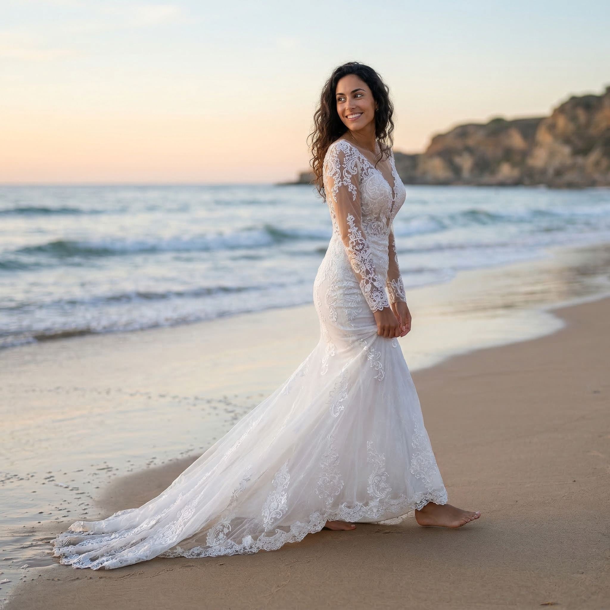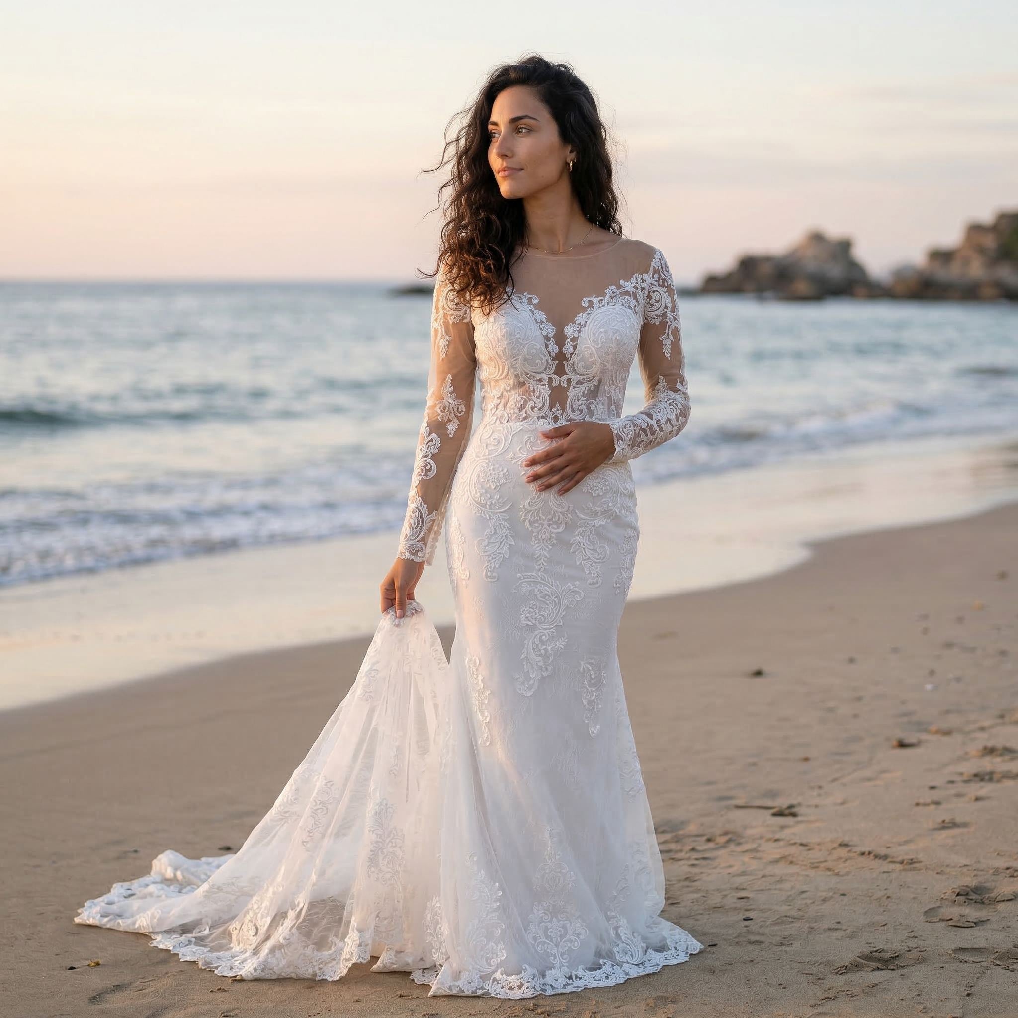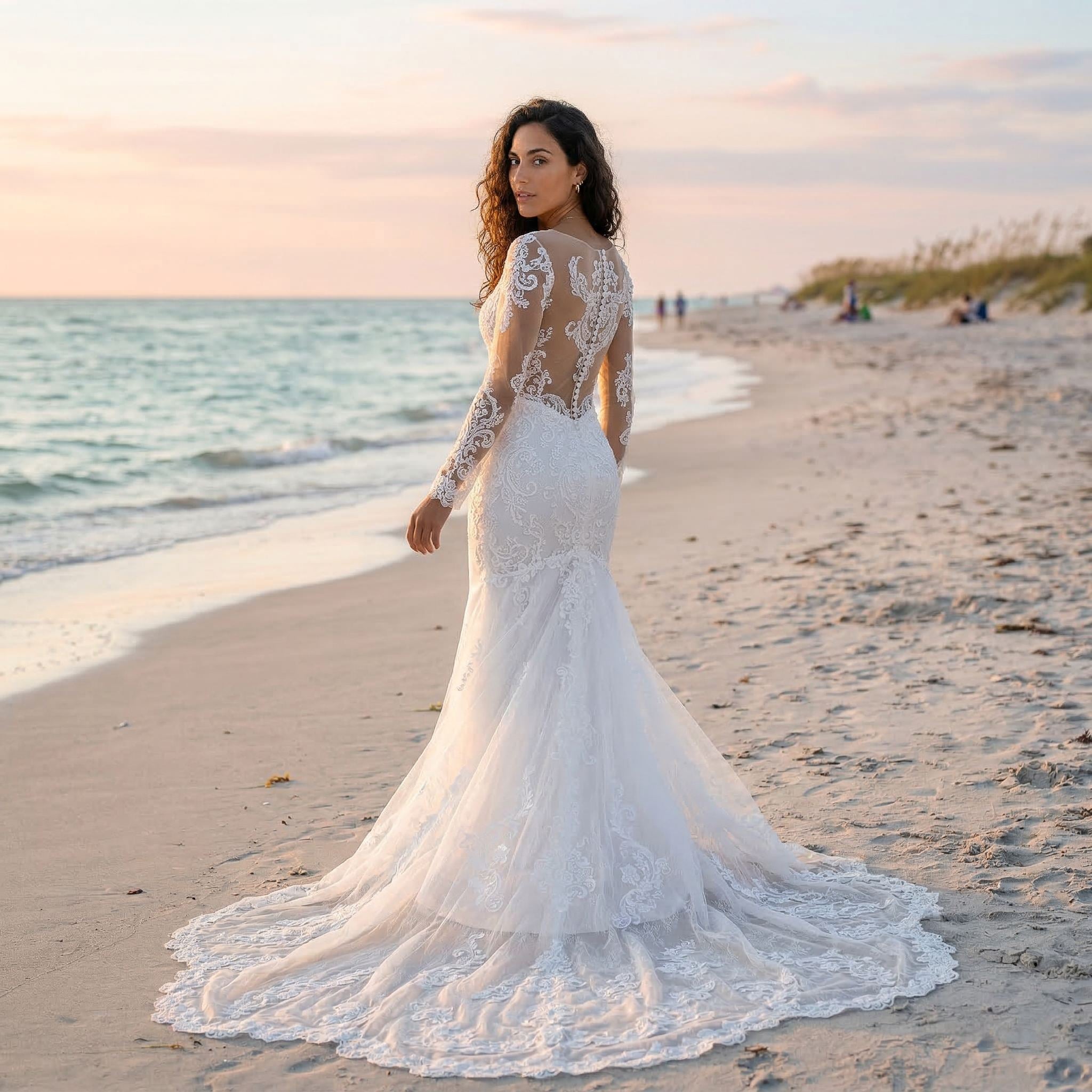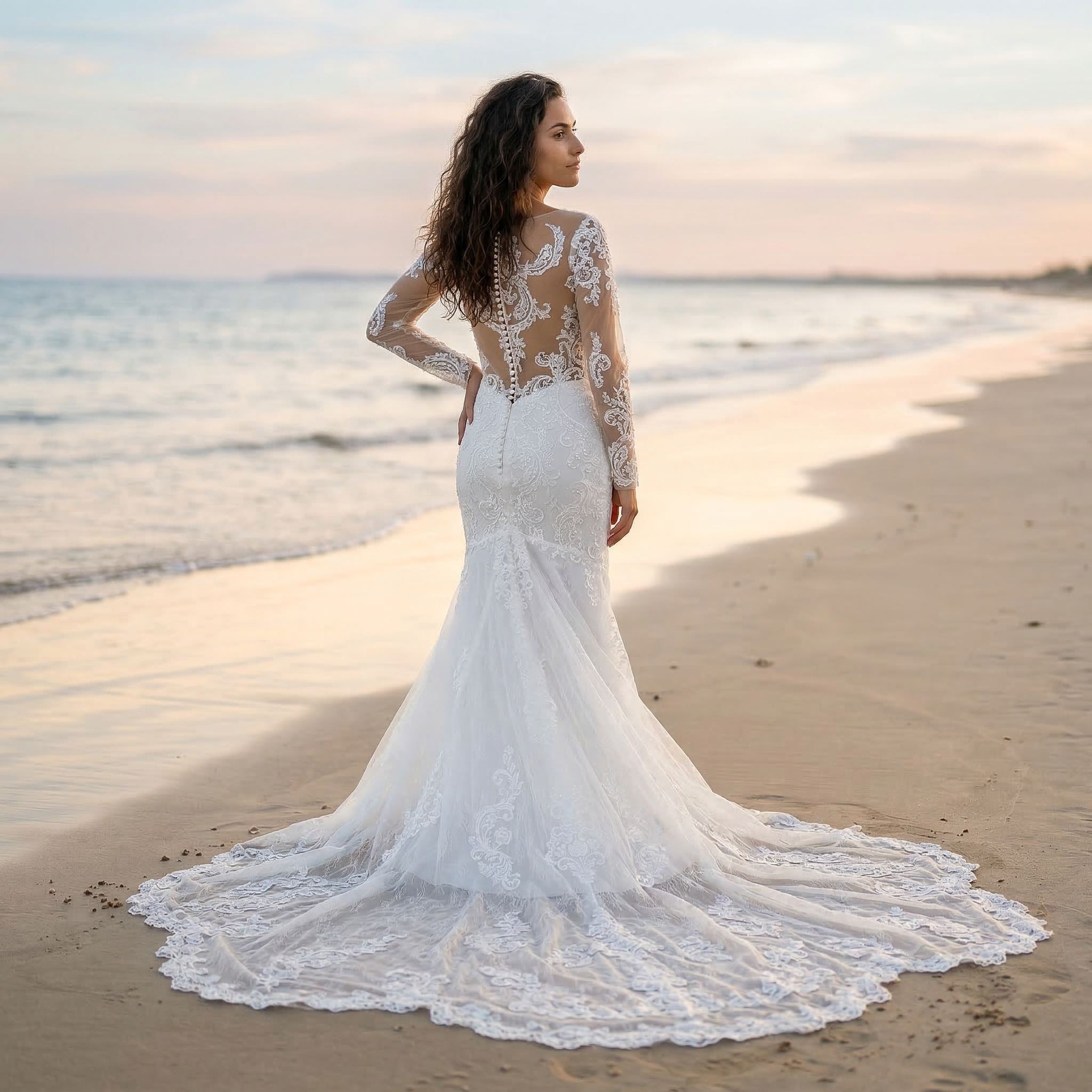 This long sleeve lace wedding dress features a fitted mermaid silhouette designed to highlight your shape with elegance and precision. The delicate lace detailing adds texture and a romantic touch, while the long sleeves bring a refined and timeless feel.