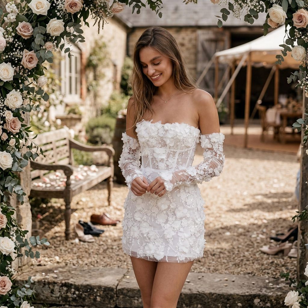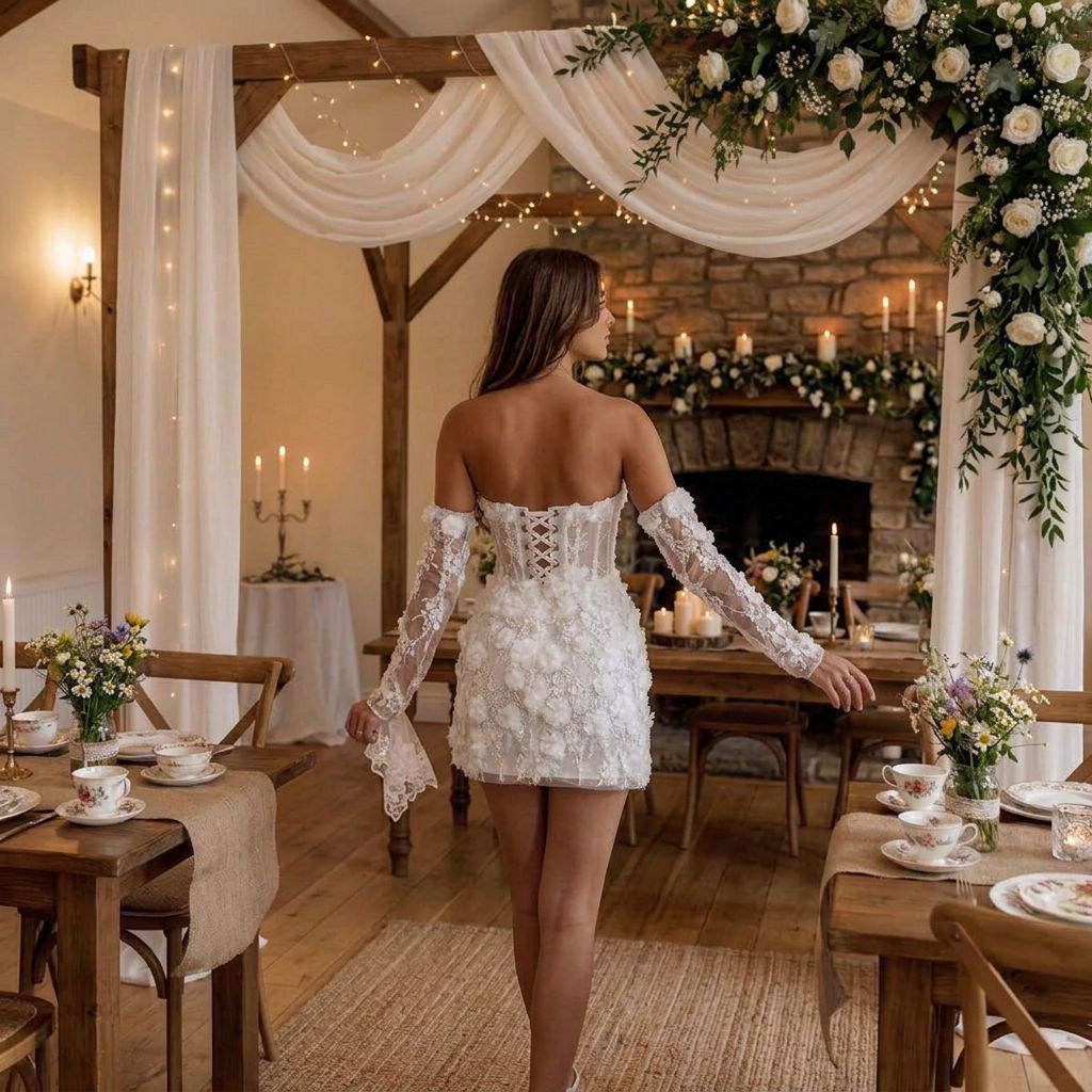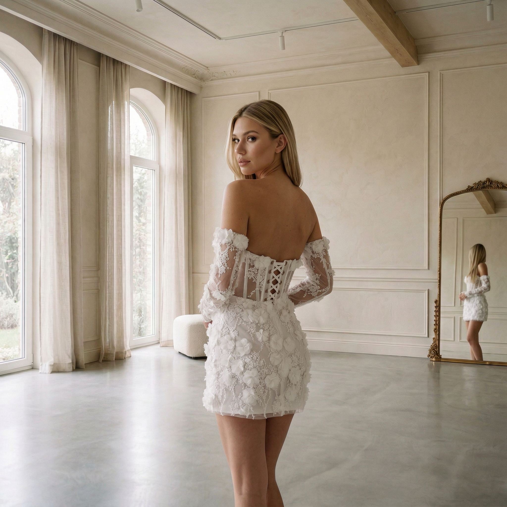 This mini wedding dress features detachable sleeves and delicate lace with 3D floral detailing for a modern and versatile bridal look. The shorter length adds a playful touch, while the intricate design keeps it elegant and refined.