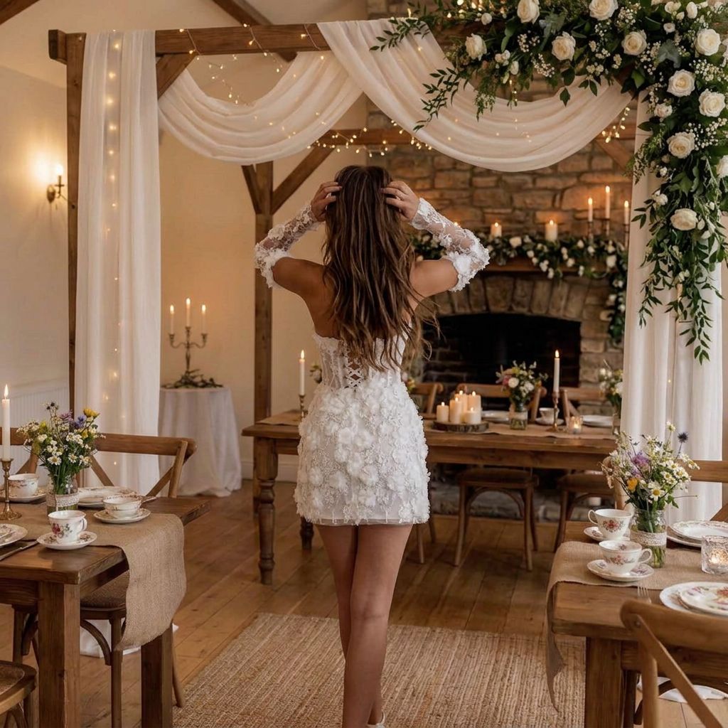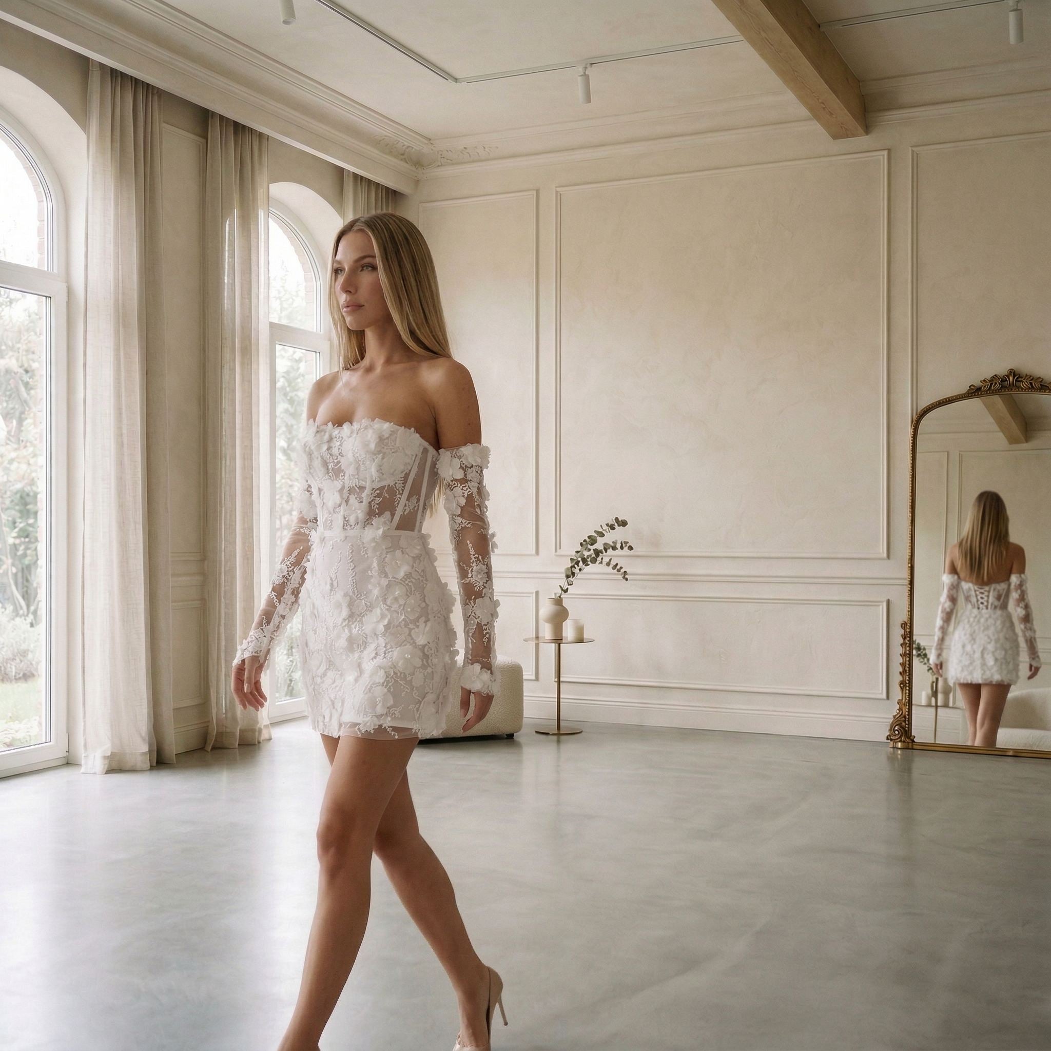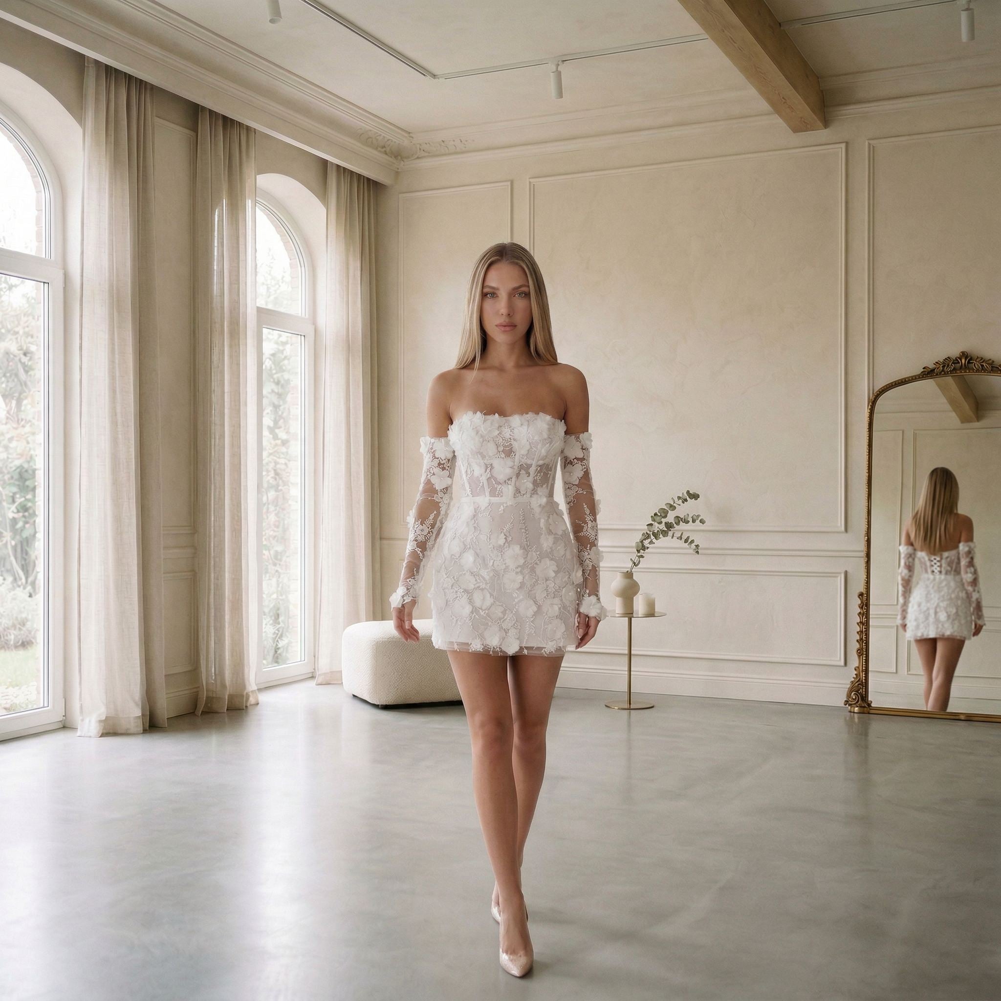 This mini wedding dress features detachable sleeves and delicate lace with 3D floral detailing for a modern and versatile bridal look. The shorter length adds a playful touch, while the intricate design keeps it elegant and refined.
