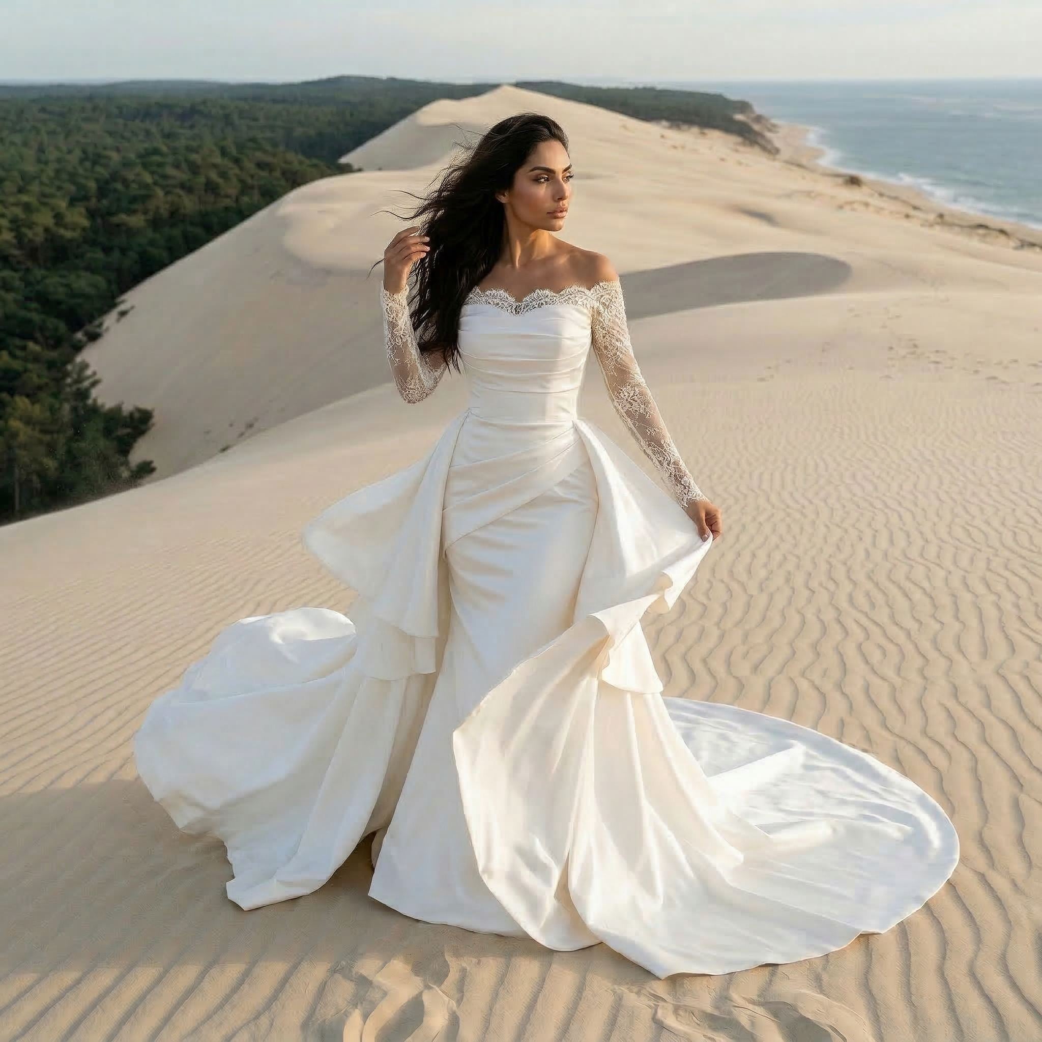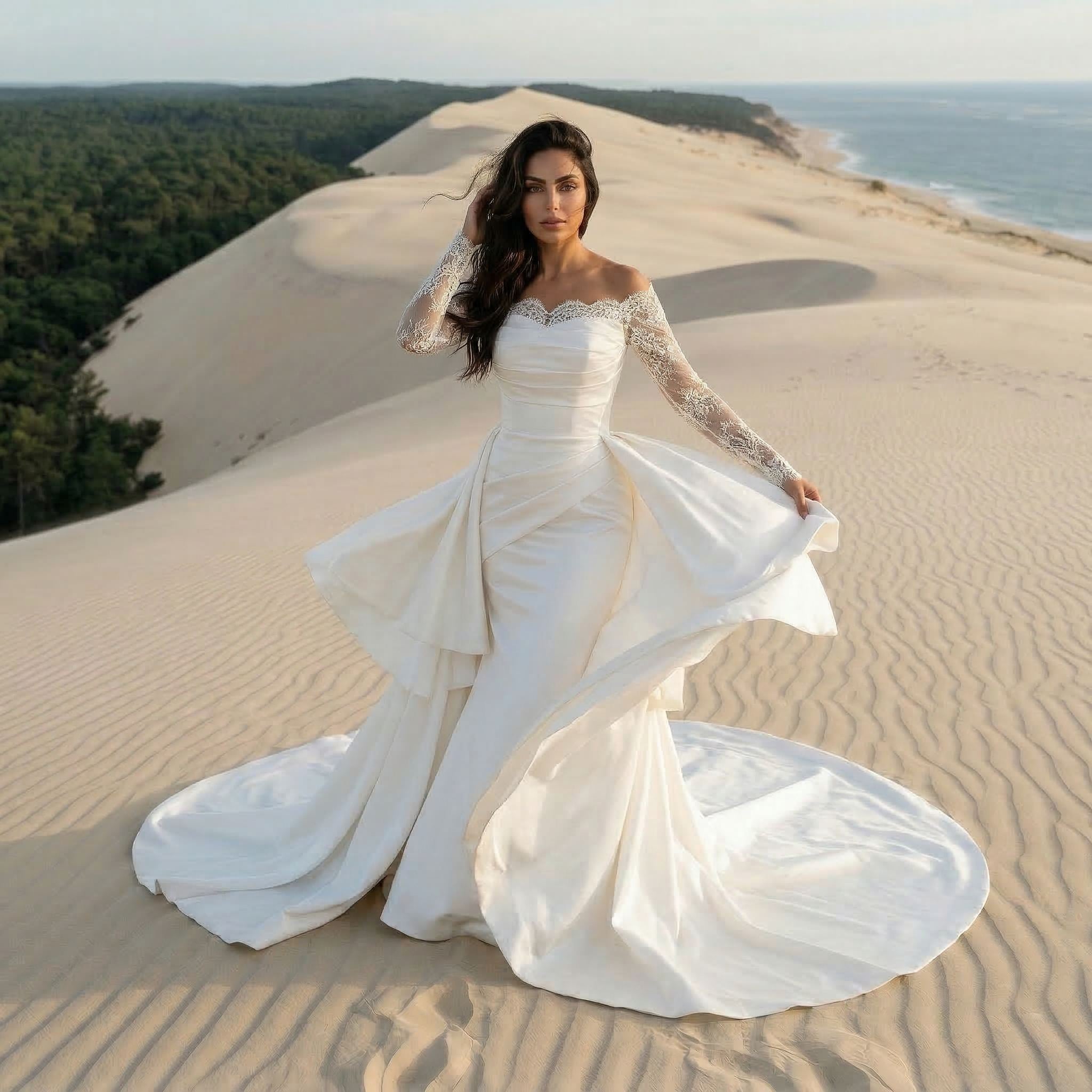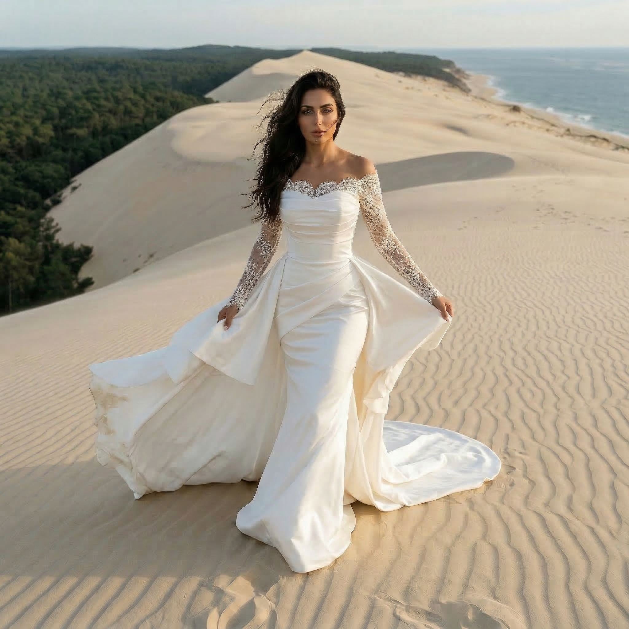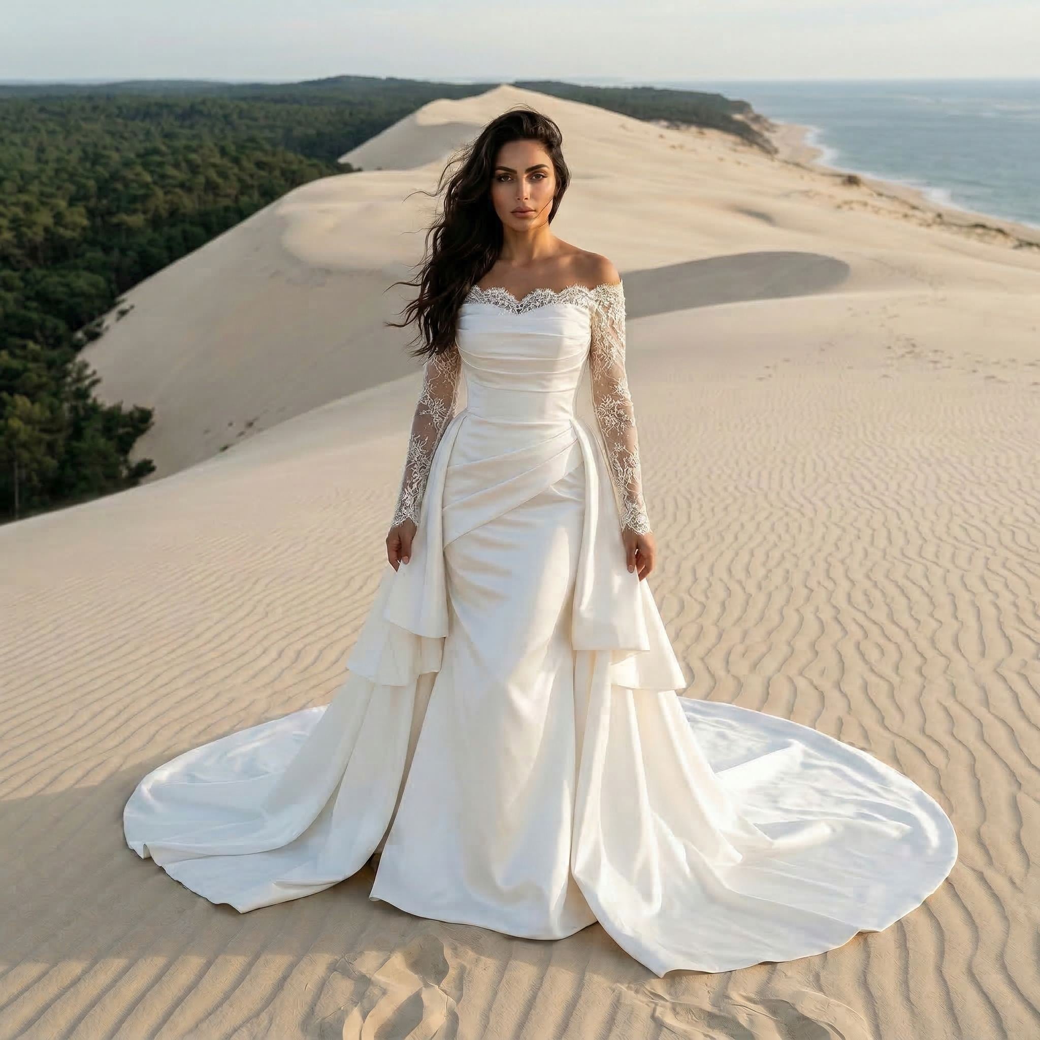 Off Shoulder Mermaid Wedding Dress Satin Bridal Gown Elegant Long Sleeve Bride Dress